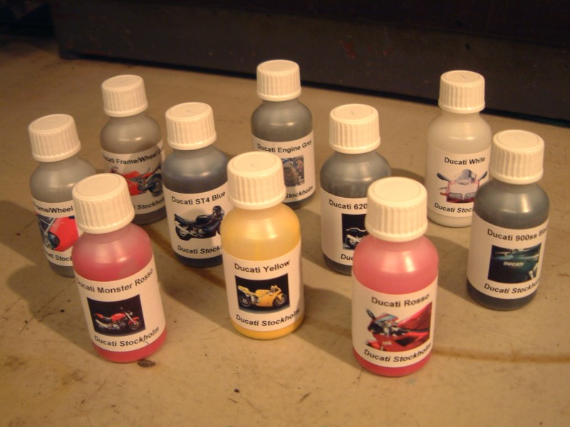 Stenskott, repa, ”skavsår” eller andra irriterande små lackskador? Vi har bättringsfärger för många Ducati modeller. . Röd, gul, svart , dark, silver, grå, blå och många fler i original kulörer. Den kommer i olika flaskor beroende på vad som finns hemma. – Kontakta oss före du beställer så färgen du söker finns i lager. – Även färg som är i ”nästan samma färg” som motorfärgen.